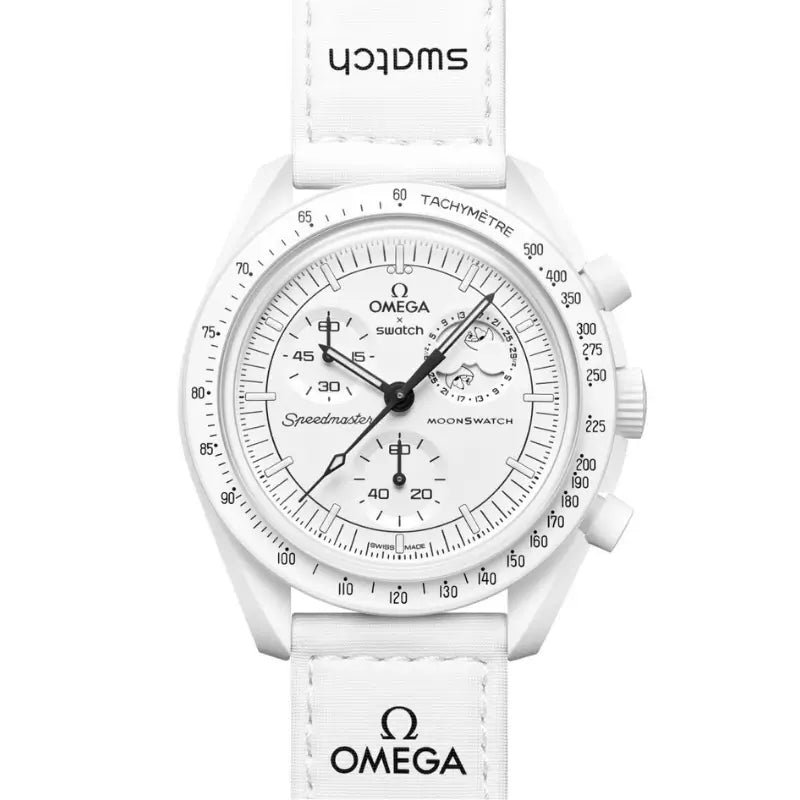In 2022, OMEGA and Swatch surprised the world by reinterpreting the legendary OMEGA Speedmaster Moonwatch — the first watch ever worn on the Moon — in an innovative edition. This unexpected and bold collaboration gave rise to a line of chronographs that quickly captured a global audience with their universe-inspired design. Crafted from the revolutionary Bioceramic material and retaining the iconic features of the Speedmaster Moonwatch, these watches have become an accessible and modern way to celebrate a true classic of watchmaking.
