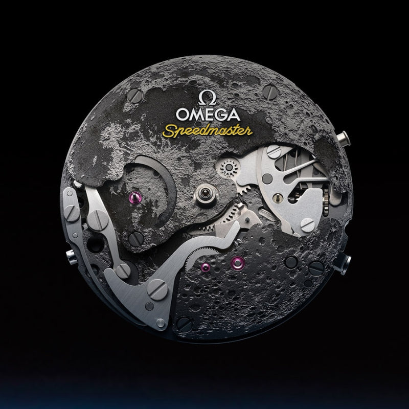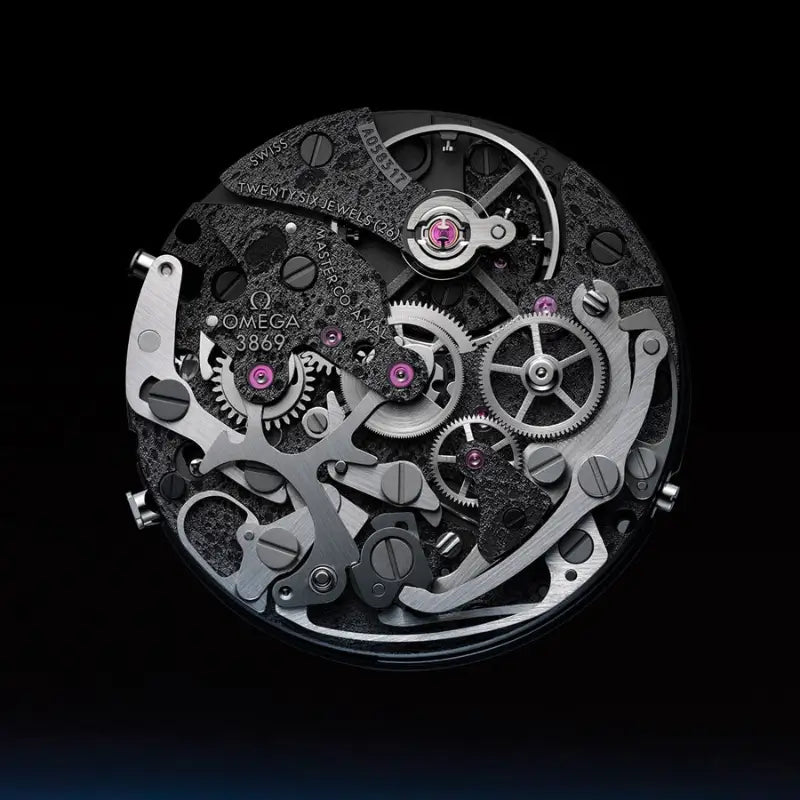Manual-winding chronograph movement with Co-Axial escapement. Certified as a Master Chronometer and approved by METAS, it is resistant to magnetic fields up to 15,000 gauss. Textured and darkened lunar relief on the main plate and bridges, with greater lunar detail compared to the previous Calibre 1869, thanks to precise laser engraving and contrasting surfaces.