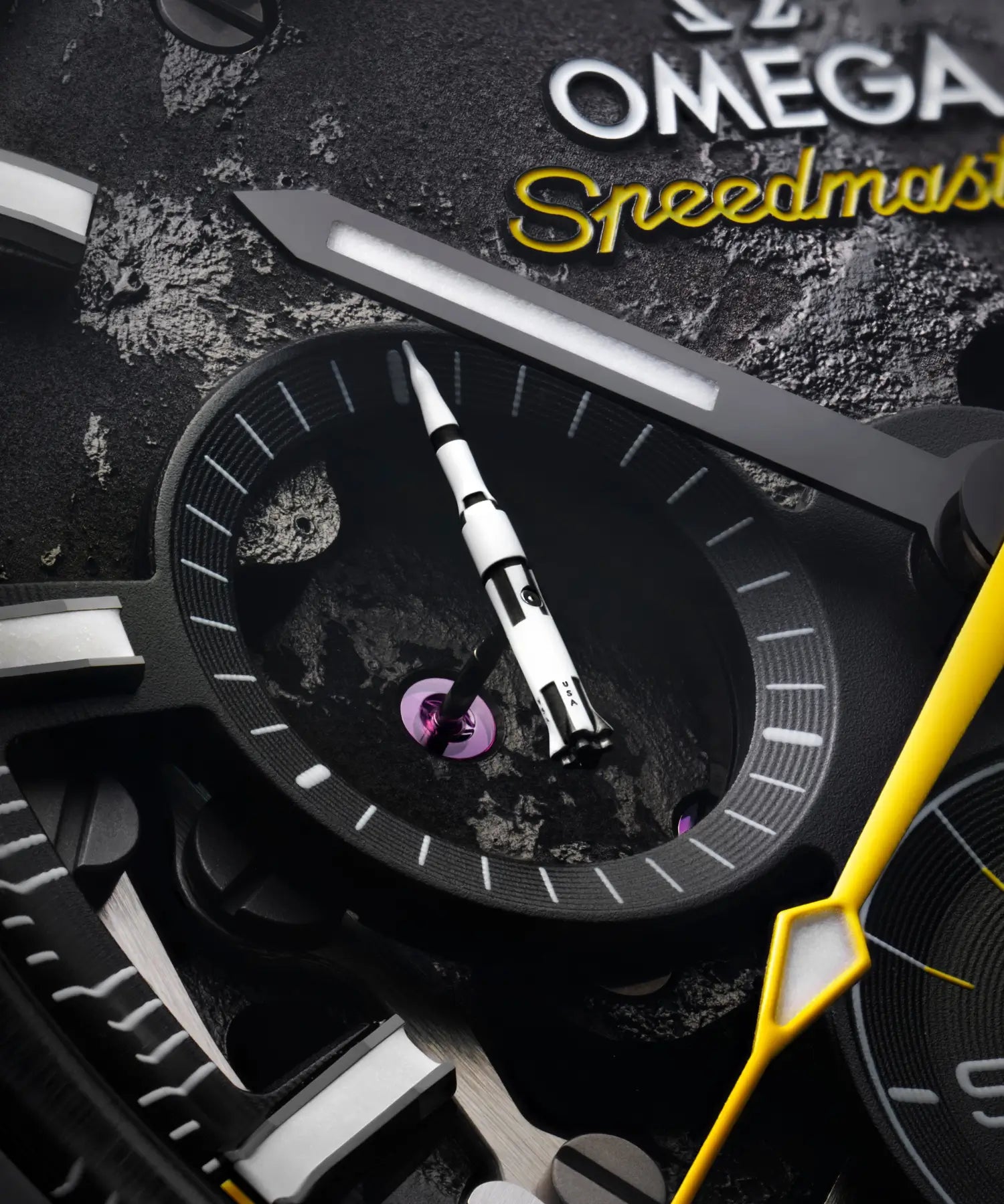 The watch features a black rubber strap with a yellow interior, varnished yellow hands, a bezel with a laser-engraved tachymeter scale, and a subdial hand shaped like the Saturn V rocket, made in Grade 5 titanium.
