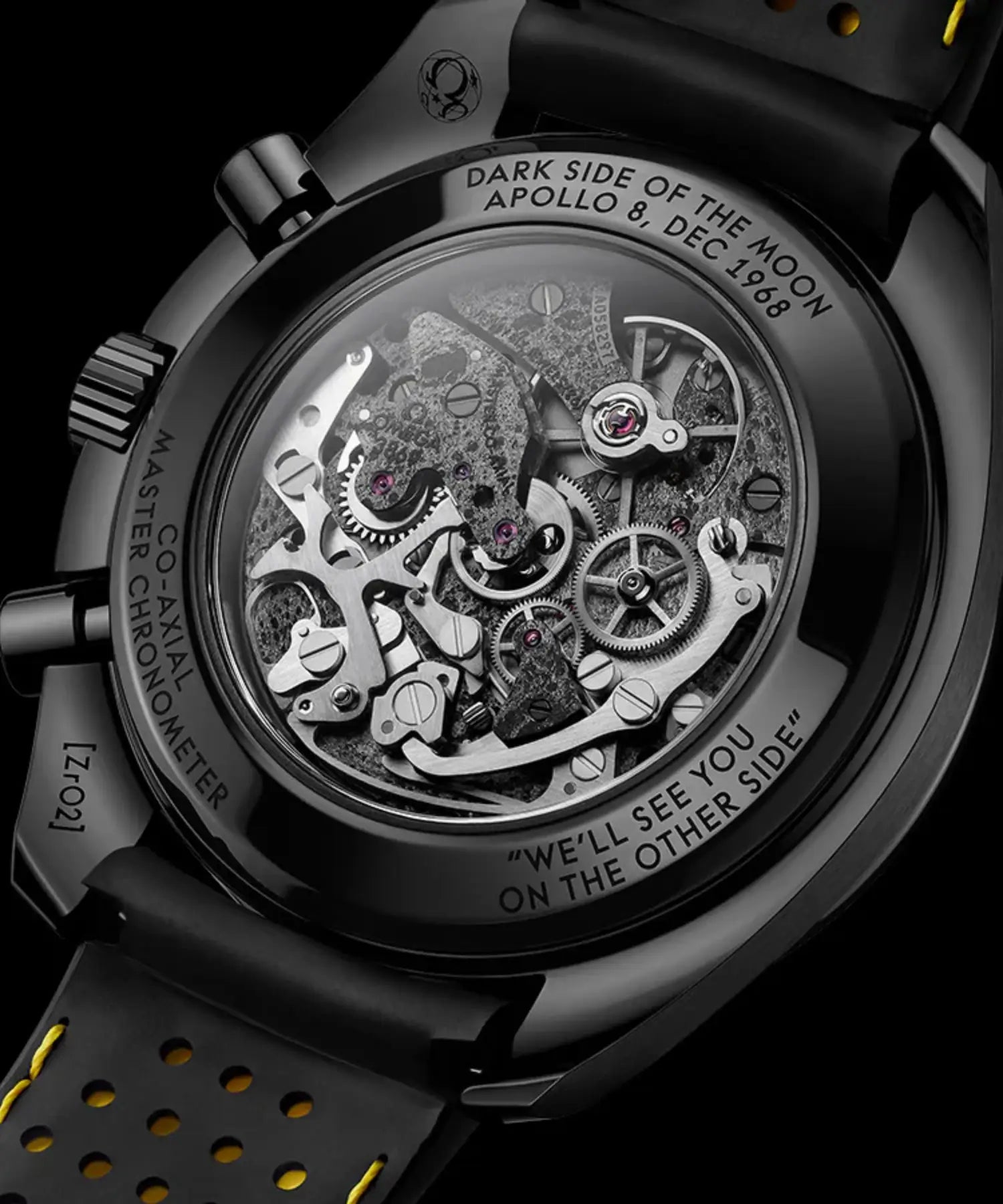 Inside, the OMEGA Co-Axial Master Chronometer 3869 calibre ensures exceptional precision and performance. Engravings on the case back include: “APOLLO 8, DEC 1968”, “DARK SIDE OF THE MOON”, “WE’LL SEE YOU ON THE OTHER SIDE” and “CO-AXIAL MASTER CHRONOMETER”.