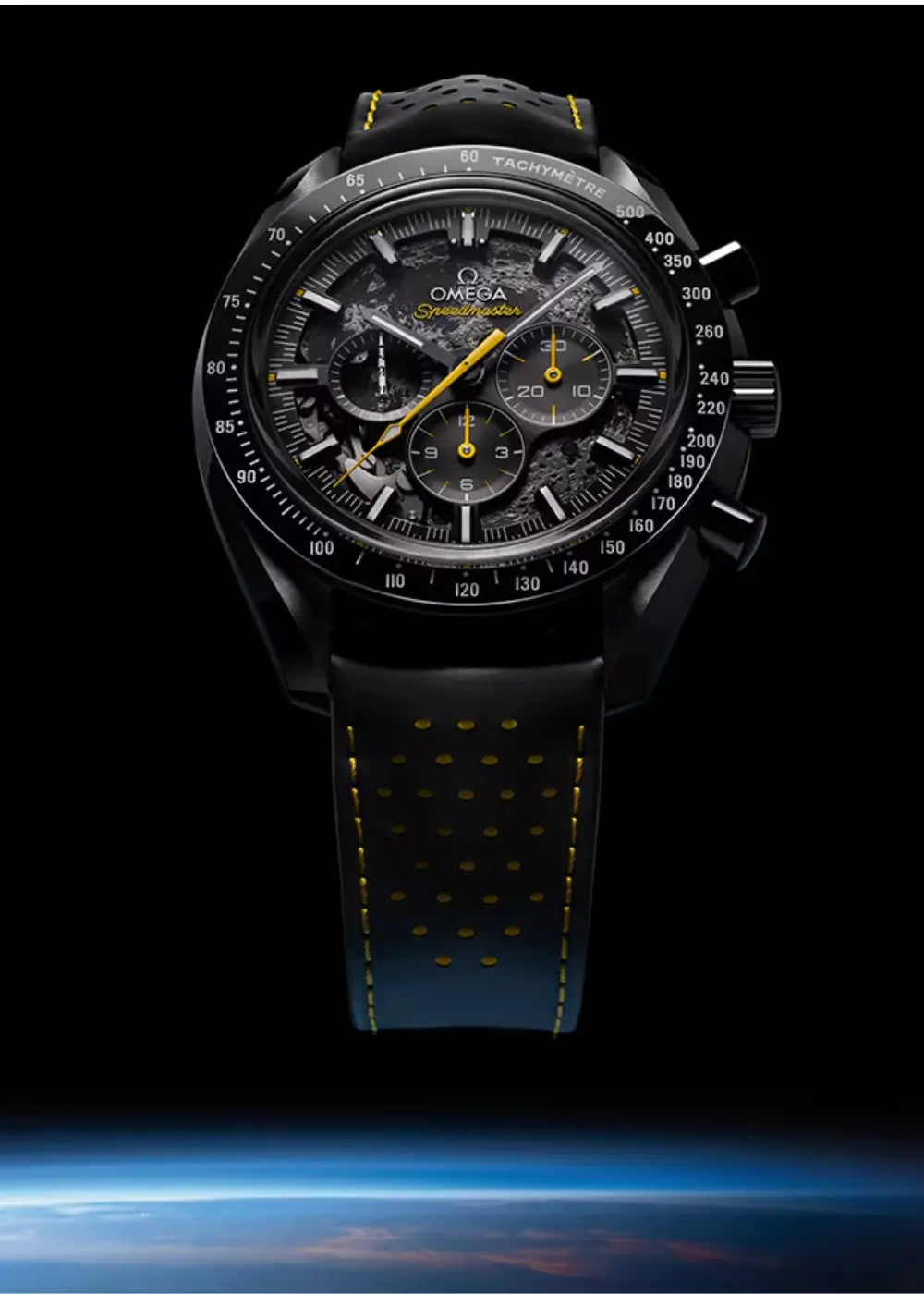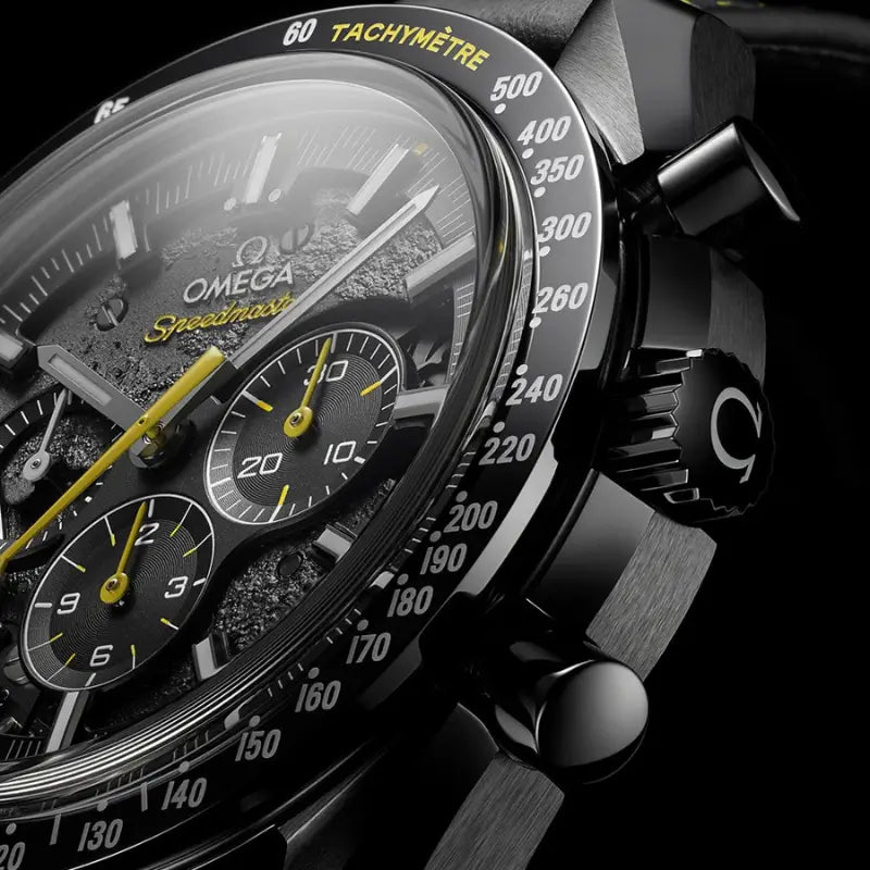 The OMEGA Speedmaster Apollo 8, inspired by the six historic lunar landings, celebrates the brand’s space legacy. This 44.25 mm black ceramic model stands out for its laser-ablated darkened movement, representing the lunar surface — the visible side is shown through the skeletonised dial, and the hidden side through the case back.