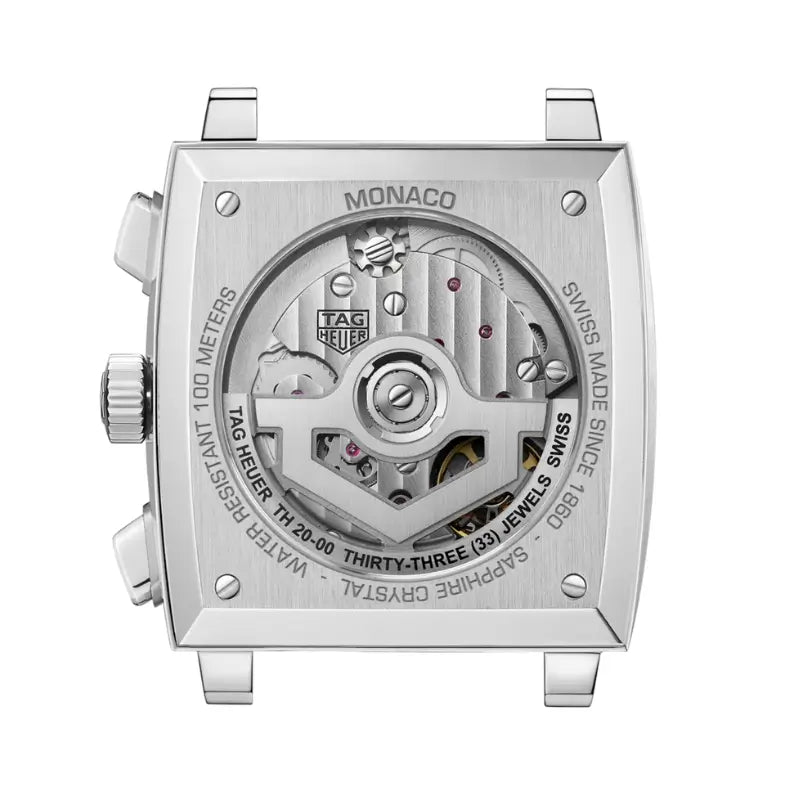 This Monaco chronograph features an elegant sunray-brushed black dial within a 39 mm square case, complemented by a red running seconds indicator. To celebrate our most iconic timepiece, we have revisited the traditional colours of our Monaco Collection and proudly present our in-house manufactured TH20-00 movement.